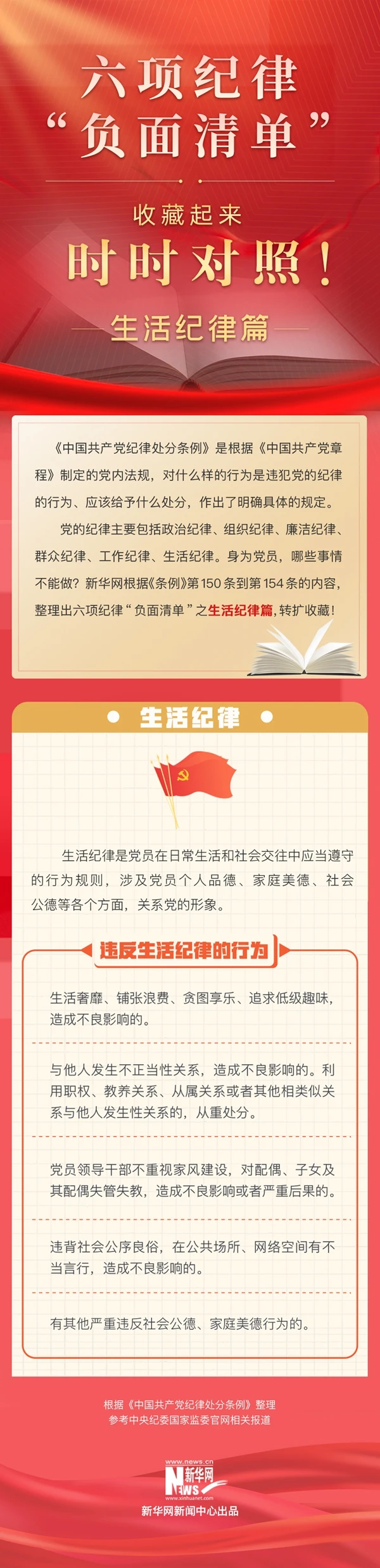 當(dāng)前,全黨正在開展黨紀(jì)學(xué)習(xí)教育。這次黨紀(jì)學(xué)習(xí)教育明確要聚焦解決一些黨員、干部對黨規(guī)黨紀(jì)不上心、不了解、不掌握等問題,組織黨員特別是黨員領(lǐng)導(dǎo)干部認(rèn)真學(xué)習(xí)《中國共產(chǎn)黨紀(jì)律處分條例》,做到學(xué)紀(jì)、知紀(jì)、明紀(jì)、守紀(jì),搞清楚黨的紀(jì)律規(guī)矩是什么,弄明白能干什么、不能干什么,把遵規(guī)守紀(jì)刻印在心,內(nèi)化為言行準(zhǔn)則,進(jìn)一步強(qiáng)化紀(jì)律意識、加強(qiáng)自我約束、提高免疫能力,增強(qiáng)政治定力、紀(jì)律定力、道德定力、抵腐定力,始終做到忠誠干凈擔(dān)當(dāng)。今天推出“負(fù)面清單”之生活紀(jì)律篇,一起收藏學(xué)習(xí)。