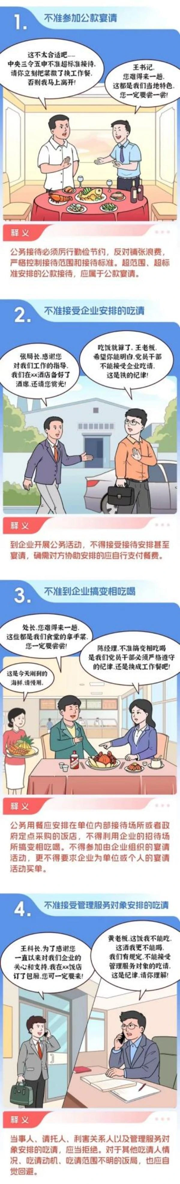 12.不準(zhǔn)參加其他違反規(guī)定、有損形象的吃請。吃請聚會既要遵守黨紀(jì)條規(guī),分清時間場合,也要尊重當(dāng)?shù)匾恍╋L(fēng)俗習(xí)慣,注意社會影響。對于一些明顯違反紀(jì)律規(guī)定、違背公序良俗、可能損害黨員干部隊伍形象的飯局,應(yīng)自覺回避。