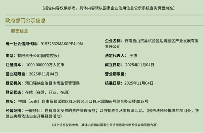 近日,基金公司受托管理的云南自由貿(mào)易試驗區(qū)紅河片區(qū)產(chǎn)融壹號股權(quán)投資基金有限責任公司(以下簡稱“產(chǎn)融壹號基金公司”)下投云南自由貿(mào)易試驗區(qū)邊境園區(qū)產(chǎn)業(yè)發(fā)展有限責任公司(以下簡稱“邊境園區(qū)公司”)完成登記設立。