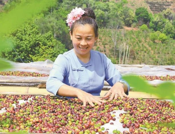 孟連咖農(nóng)晾曬咖啡豆。記者 沈浩 攝