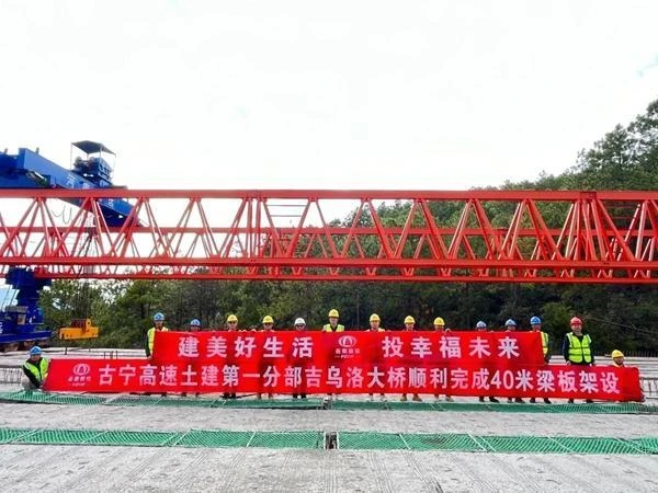 同日,隨著最后一片40米T梁精準(zhǔn)安裝到位,古寧高速土建一分部吉烏洛大橋梁板架設(shè)任務(wù)全部完成。