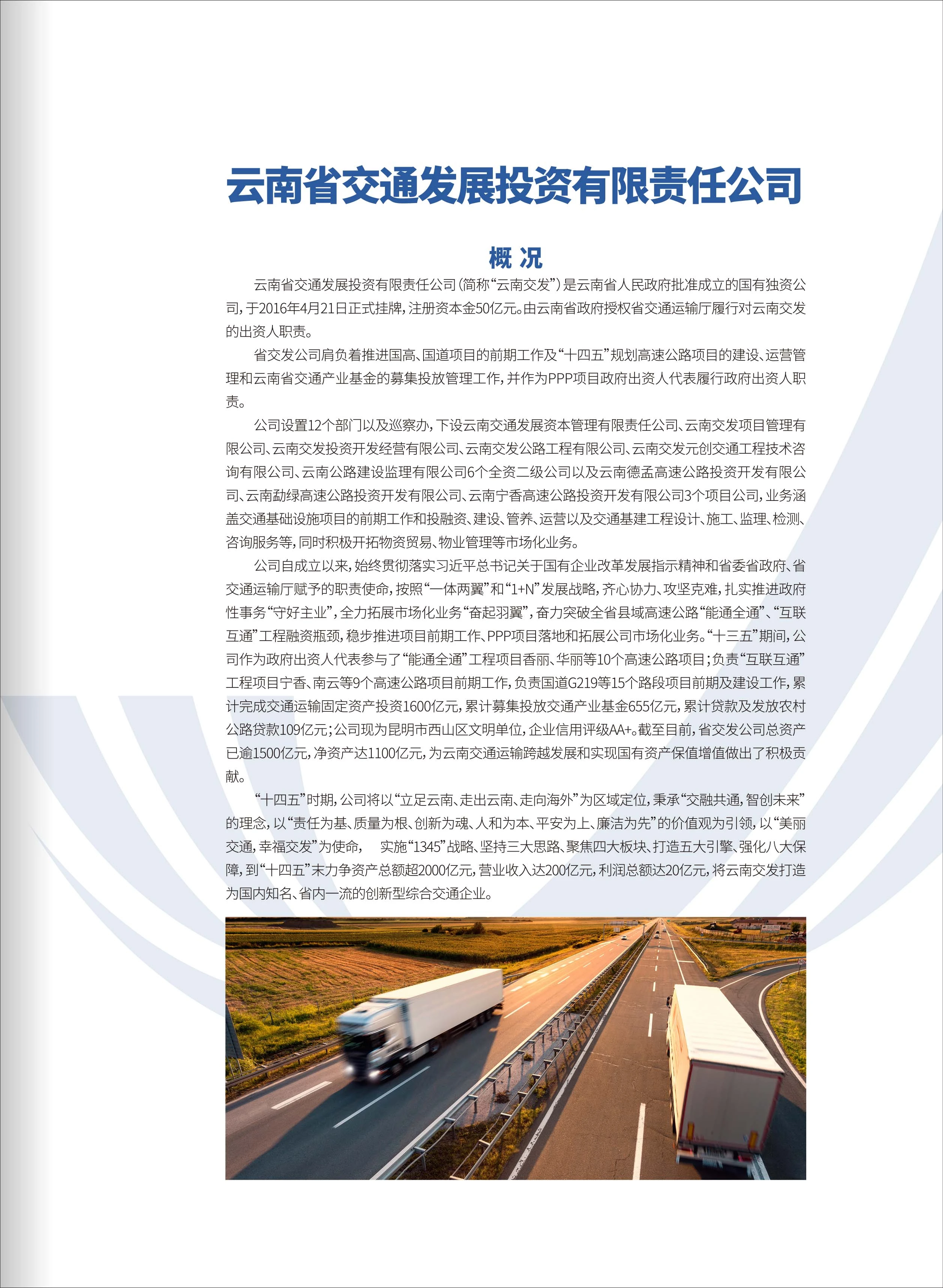 公司成立以來,緊緊圍繞省交發(fā)公司“1345”發(fā)展戰(zhàn)略及“1+N”經(jīng)營布局,秉承“持續(xù)創(chuàng)新、穩(wěn)健經(jīng)營、綠色發(fā)展、開放合作、共創(chuàng)共享”發(fā)展理念,弘揚“厚德篤行、至美致遠(yuǎn)”人文精神,堅定不移走市場化發(fā)展道路,矢志不渝做大規(guī)模、做優(yōu)產(chǎn)業(yè)、做強企業(yè)